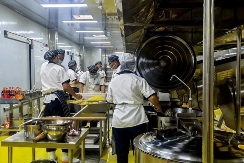 記者來(lái)到湖北桃佰園中央廚房,生產(chǎn)車間正在有條不紊地進(jìn)行生產(chǎn),在凈菜車間中,各種蔬菜在“行進(jìn)”中便實(shí)現(xiàn)了全自動(dòng)清洗,之后,便是切塊切絲等操作。最熱鬧的要數(shù)熱廚生產(chǎn)線了。一個(gè)個(gè)全自動(dòng)電磁炒鍋和燃?xì)獬村亙?nèi),多種菜品正在制作中。隨后將經(jīng)過(guò)裝盤、出庫(kù)、運(yùn)輸送到就餐人手中。